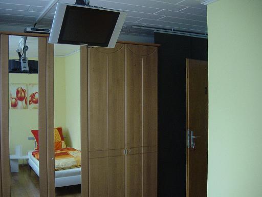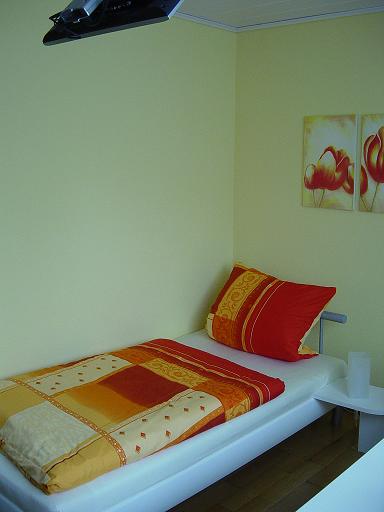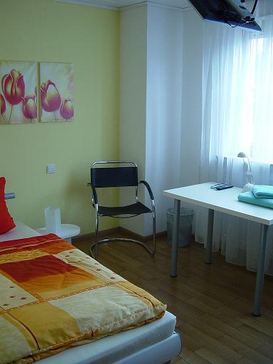 Das Zimmer ist modern eingerichtet und verfügt über ein allergikerfreundliches Bett, das Zimmer ist mit SAT TV und einem TFT Monitor ausgestattet. Zusätzlich beinhaltet das Zimmer noch einen Schreibtisch.